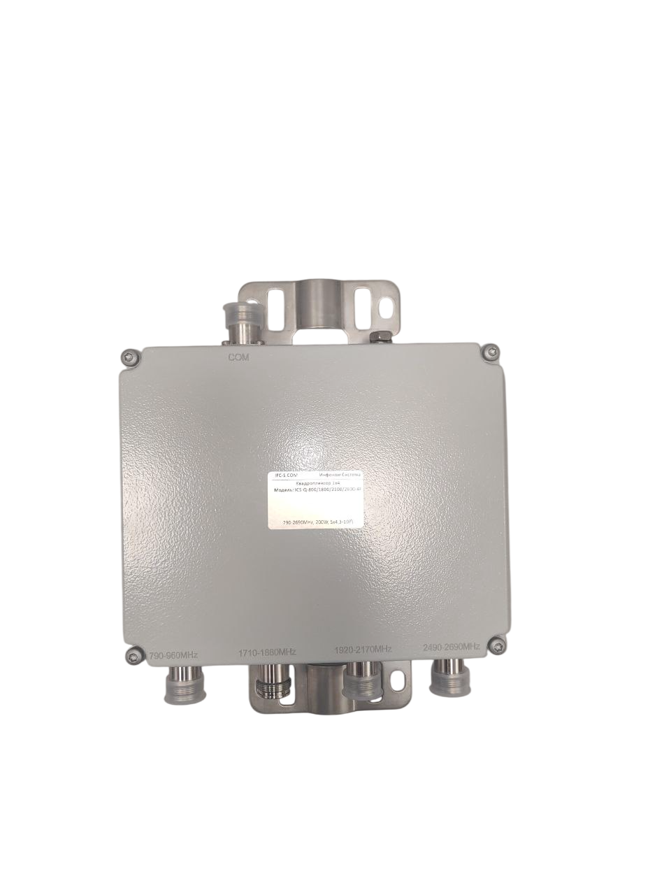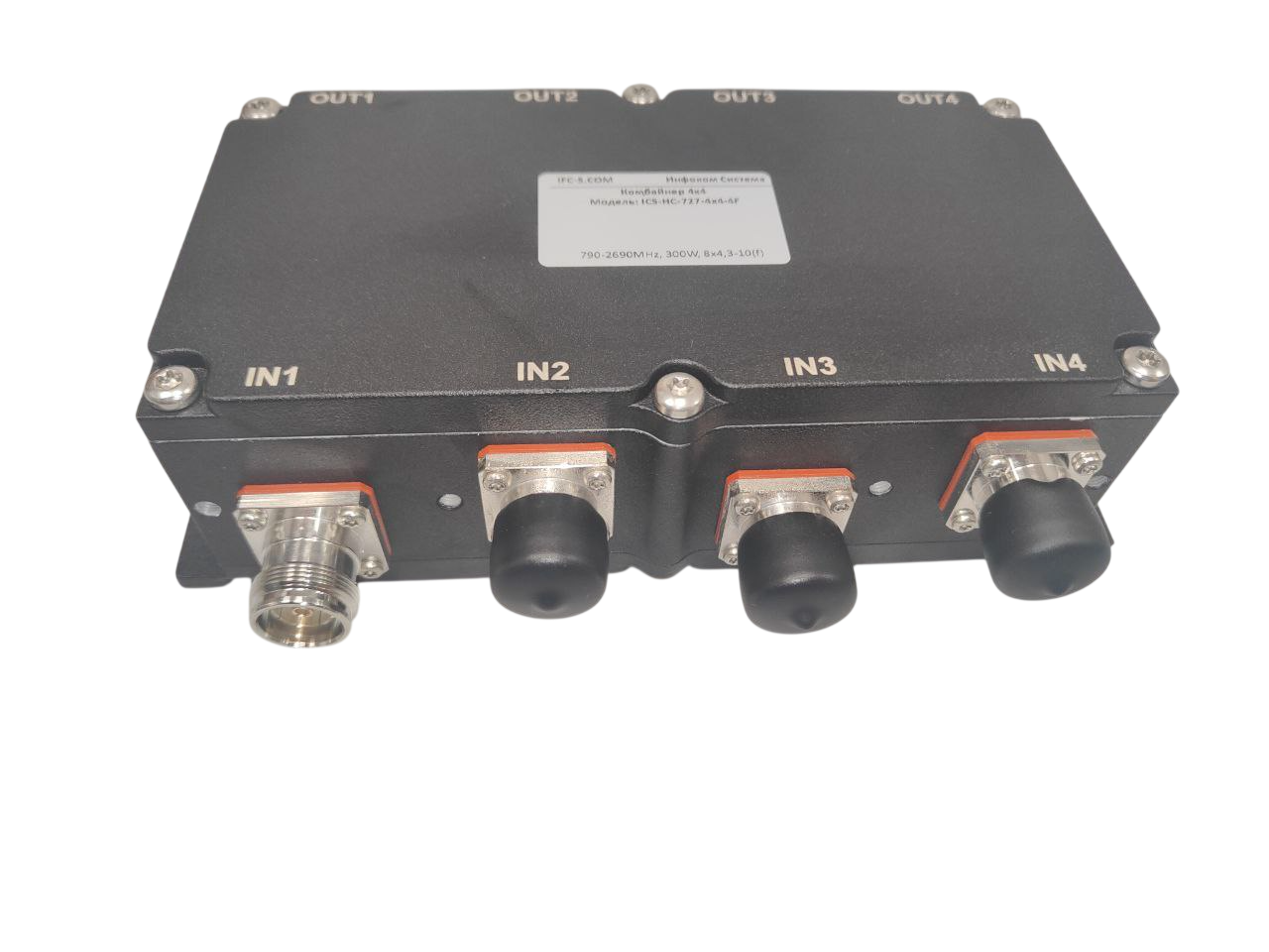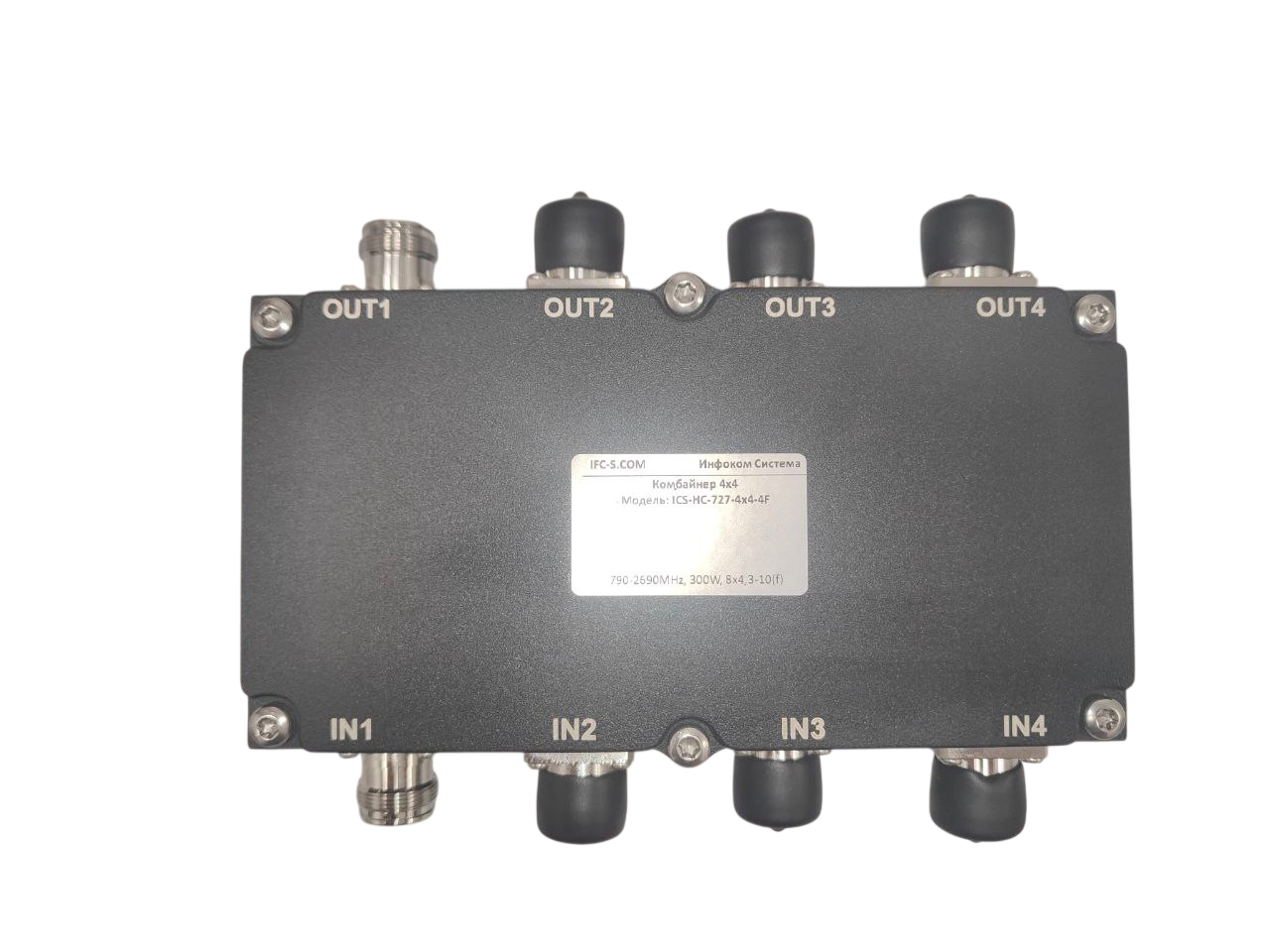 Комбайнер гибридный широкополосный (Комбайнер 4x4). Предназначен для приема сигнала от разных источников и распределения его с одинаковыми параметрами в 4 тракта. Диапазон рабочих частот сигналов 790-2690МГц, вносимое затухание < 7.1дБ. Разъемы 8х4.3/10-Female